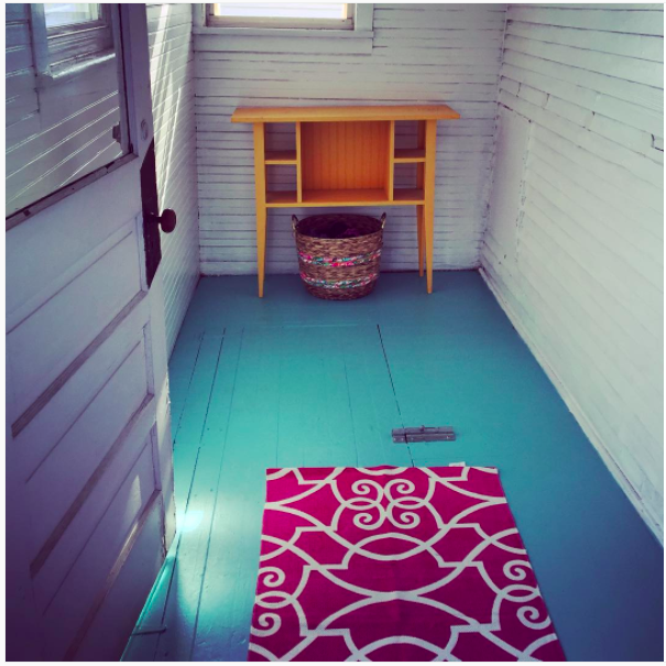 Our new-to-us house was built in 1886, so it has a lot of unique features. One of them is this little back porch/room that was added much later. When we moved in, it was dirty and covered in old, ugly linoleum tile and just wasn’t utilized very well. Since the house doesn’t have a lot of great storage in the form of closets, I wanted to make sure we utilize all available space! So one weekend Patrick and I chiseled up all the old tile, which revealed great wood panels underneath.After cleaning out the tiles (and making sure they weren’t asbestos tiles) I painted the floor a really cute minty green color. Patrick repainted all the walls white so they looked brand new and clean. The walls and the ceiling are plank walls and it looks really cute.